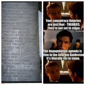 The Georgia Guidestones: More proof of their plan in plain sight. Literally written in stone. Their New World Order has a population of only 5 hundred million. Guess they'd have to get rid of quite a few people (approx. 7 billion+) to bring the "population of humanity" under "500 000 000"